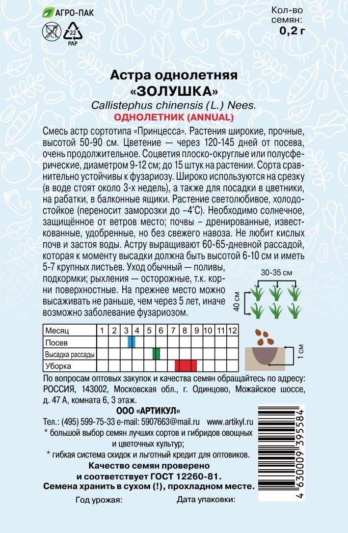 Смесь астр сортотипа "Принцесса". Растения широкие, прочные, высотой 50-90 см. Цветение - через 120-145 дней от посева, очень продолжительное. Соцветия плоско-округлые или полусферические, диаметром 9-12 см; до 15 штук на растении. Сорта сравнительно устойчивы к фузариозу. Широко используются на срезку (в воде стоят около 3-х недель), а также для посадки в цветники, на рабатки, в балконные ящики. Растение светолюбивое, холод��стойкое (переносит заморозки до –4С). Необходимо солнечное, защищённое от ветров место; почвы – дренированные, известкованные, удобренные, но без свежего навоза. Не любит кислых почв и застоя воды. Астру выращивают 60-65-дневной рассадой, которая к моменту высадки должна быть высотой 6-10 см и иметь 5-7 крупных листьев. Уход обычный - поливы, подкормки; рыхления – осторожные, т.к. корни поверхностные. На прежнее место можно высаживать не раньше, чем через 5 лет, иначе возможно заболевание фузариозом.