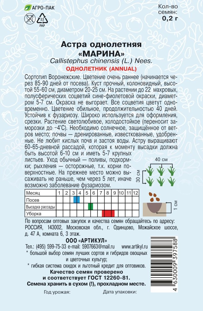 Сортотип Воронежские. Цветение очень раннее (начинается через 85-90 дней от посева). Куст прочный, колоновидный, высотой 55-60 см, диаметром 20-25 см. На растении до 22 махровых, полусферических соцветий сине-фиолетовой окраски, диаметром 5-7 см. Окраска не выгорает. Все соцветия цветут одновременно. Цветение обильное, продолжительностью 40 дней. Устойчив к фузариозу. Широко используется для оформления, срезки. Растение светолюбивое, холодостойкое (переносит заморозки до —4С). Необходимо солнечное, защищённое от ветров место; почвы — дренированные, известкованные, удобренные. Не любит кислых почв и застоя воды. Астру выращивают 60-65-дневной рассадой, которая к моменту высадки должна быть высотой 6-10 см и иметь 5-7 крупных листьев. Уход обычный — поливы, подкормки; рыхления — осторожные, т.к. корни поверхностные. На прежнее место можно высаживать не раньше, чем через 5 лет, иначе возможно заболевание фузариозом.