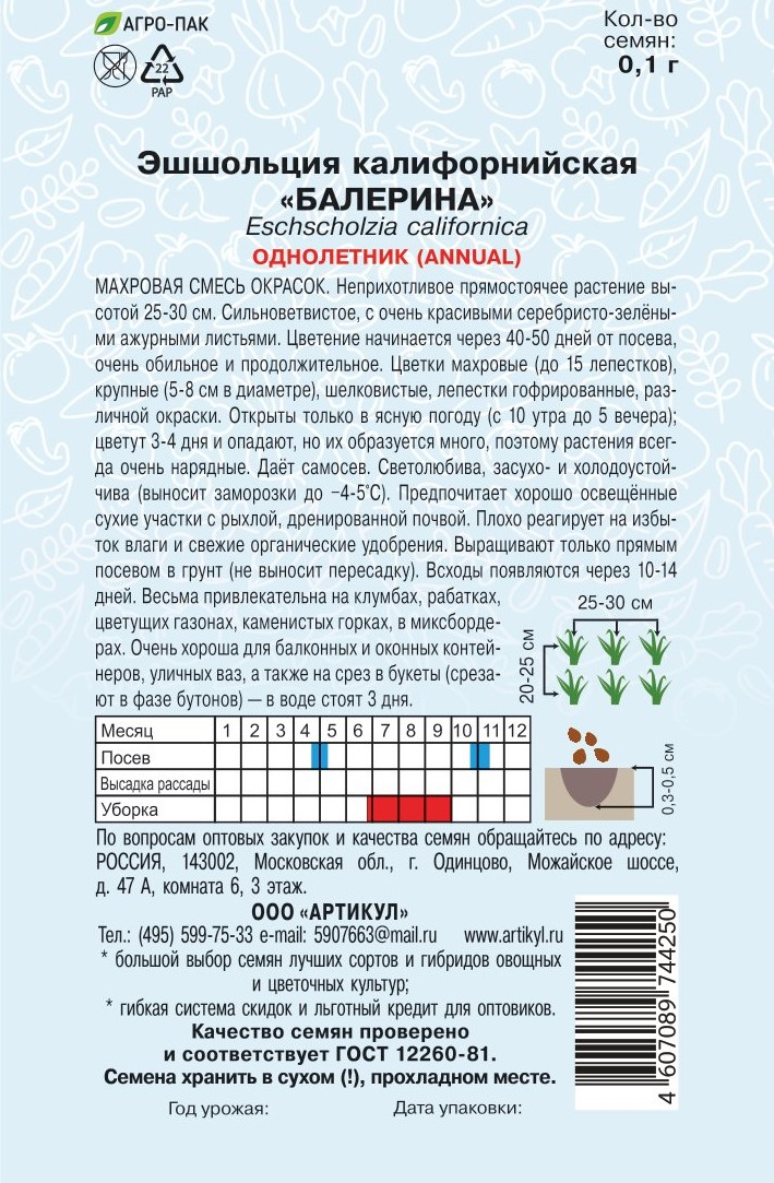Семена Артикул Эшшольция Калифорнийская Балерина, 10г