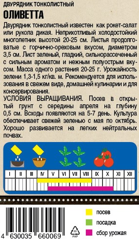 Двурядник тонколистный известенкак рокет-салат или руккола дикая. Неприхотливый холодостойкий многолетник высотой 20-25 см. Листья продолговатые с горчично-ореховым вкусом, диаметром 3,5 см. Лист зеленый, гладкий, сильнорассеченный с сильным ароматом и нежным полуострым вкусом.