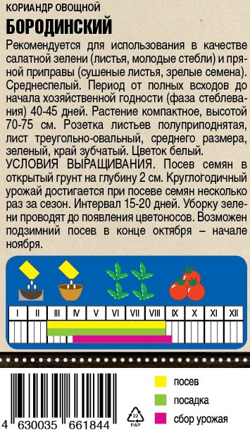 Семена Тимирязевский питомник кориандр овощной Бородинский 3 г подходит для использования в салатах и как пряная приправа. Среднеспелый сорт, являет хорошим медоносом. Широко используется как пряная приправа для хлебов и кондитерских изделий.