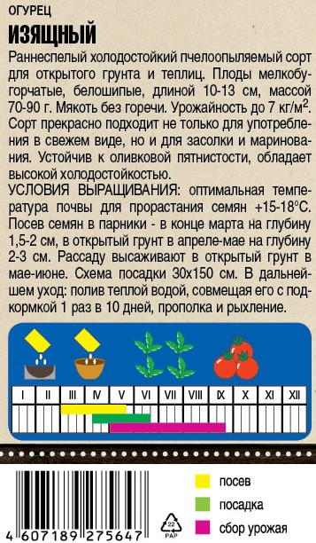 Огурец Изящный –сорт раннего срока созревания, с высокой урожайностью. Куст средневетвистый, невысокий. Урожайность с одного кв. м. до 6 кг. Форма плода цилиндрическая. Кожура светло-зеленого цвета с белыми полосами и шипами. Вкус классический. Мякоть сочная и плотная. Вес плода 120-140 гр.