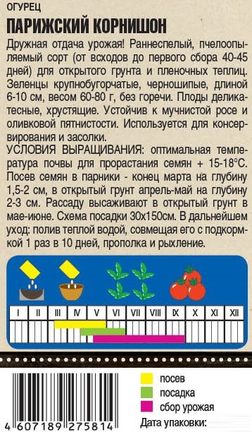 Огурец Парижский – сорт раннего срока созревания, с высокой урожайностью. Куст средневетвистый, невысокий. Урожайность с одного кв. м. до 4-6 кг. Форма плода удлиненно-цилиндрическая. Кожура темно-зеленого цвета со светлыми полосами и белыми шипами. Вкус классический. Мякоть сочная и плотная. Вес плода 80-90 гр.