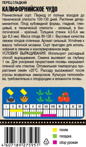 Перец Калифорнийское чудо отличается прекрасным сладким вкусом с классическим послевкусием и сильным ароматом. Пригоден для употребления в пищу и всех видов переработки с момента достижения технической спелости. Семена предназначены для посева в грунт.