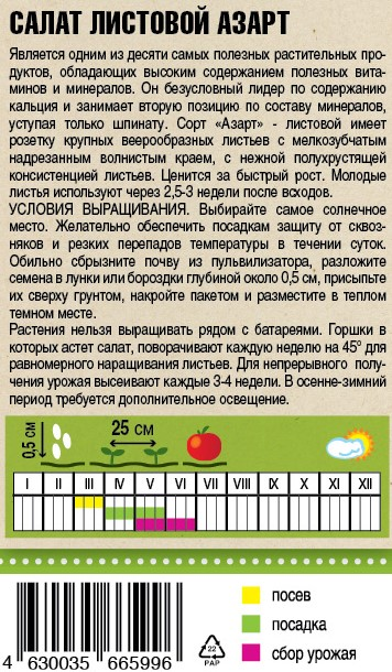 Семена Тимирязевский питомник Салат Листовой Азарт , 3г – среднеспелый сорт. Имеет крупные веерообразные листья с волнистыми краями, хорошо насыщенные вкусом и витаминами. В высоту куст достигает 25-27 см. Данный сорт рекомендуется к выращиванию в теплицах. Посадка производится в апреле-мае, на глубину 1-1,5 см. при всходе растений, их необходимо прореживать, чтобы расстояние между розетками составлял�� 25-30 см. урожай созревает через 64 дня после посева. При хорошем уходе масса кочана может достигать 250 грамм.