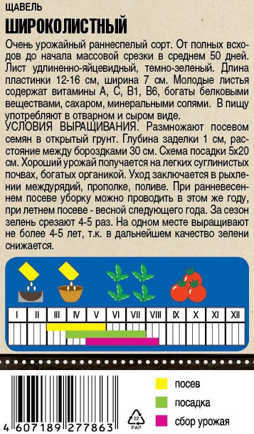 Щавель Широколистный – травянистое многолетие морозостойкое растение. Сорт раннего срока созревания. Урожайность с 1 кв.м. 5-6 кг. Листовые пластины удлиненно-овальные, зеленые. Вкус щавеля сочный, нежный, слабокислый. Данная культура богата содержанием витамина С.