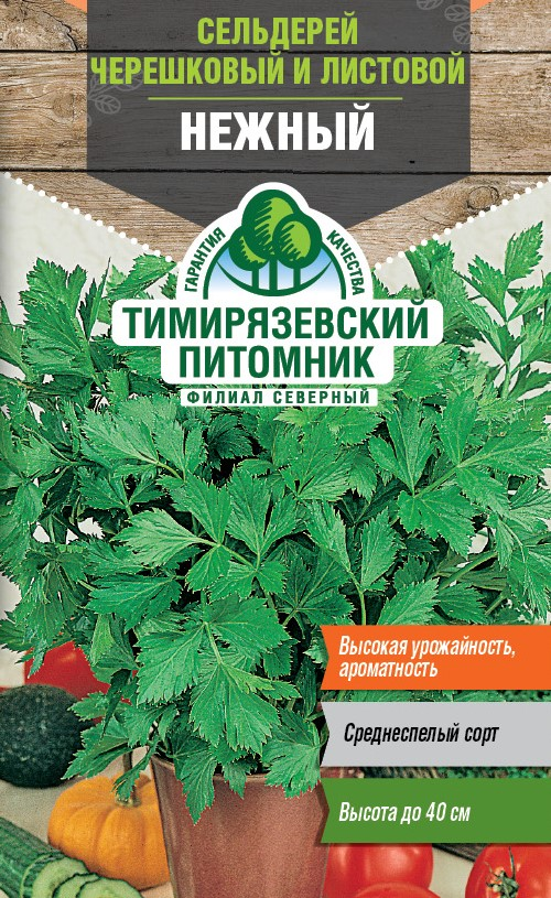 Сельдерей Нежный листовой – сорт среднеспелого срока созревания, с урожайностью 1 кв.м. 3.5 кг. Листья глянцевые, ароматные, собраны в крупную розетку, массой 140-150 гр. Сельдерей имеет высокое содержание полезных веществ.