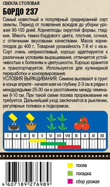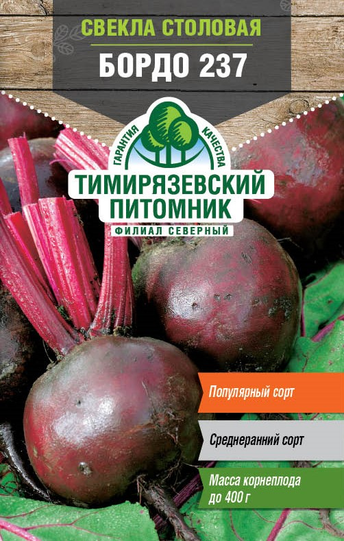 Свекла Бордо 237 –сорт среднераннего срока созревания с высокой урожайностью, с 1 кв.м. 3.5-8 кг. Корнеплод крупный, округлой формы, темно-бардового цвета. Масса 230-250 гр. Сорт данной свёклы имеет превосходные вкусовые качества, высокую урожайность и содержит много полезных веществ.