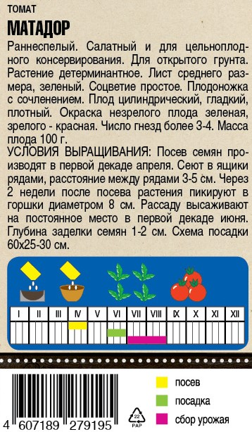 Томат Матадор ранний – раннеспелого срока созревания, с высокой урожайностью. Куст высотой 70 см. Для употребления в свежем виде и консервирования. Плод плотный, цилиндрической формы. Кожица красного цвета. Мякоть сладкая и сочная. Масса томата до 100 гр.