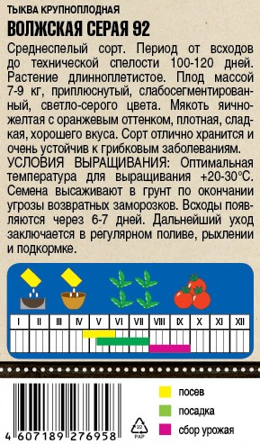 Семена Тимирязевский питомник Тыква Крупноплодная Волжская Серая 92, 2г