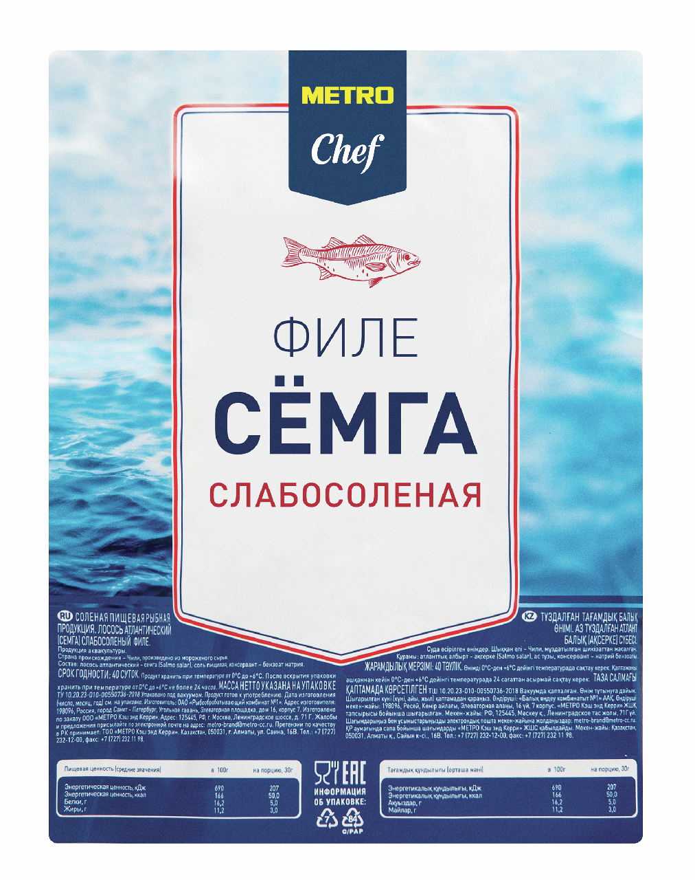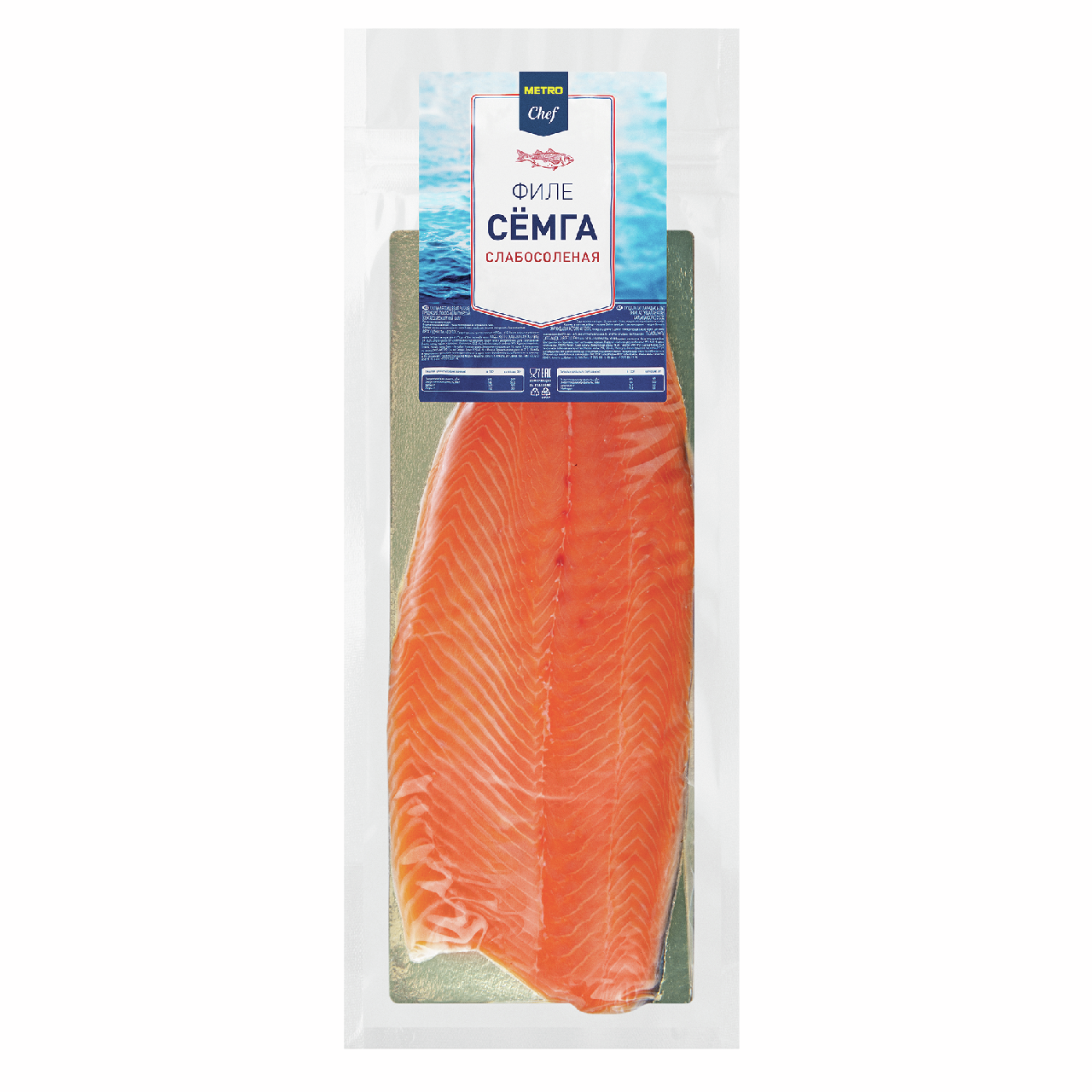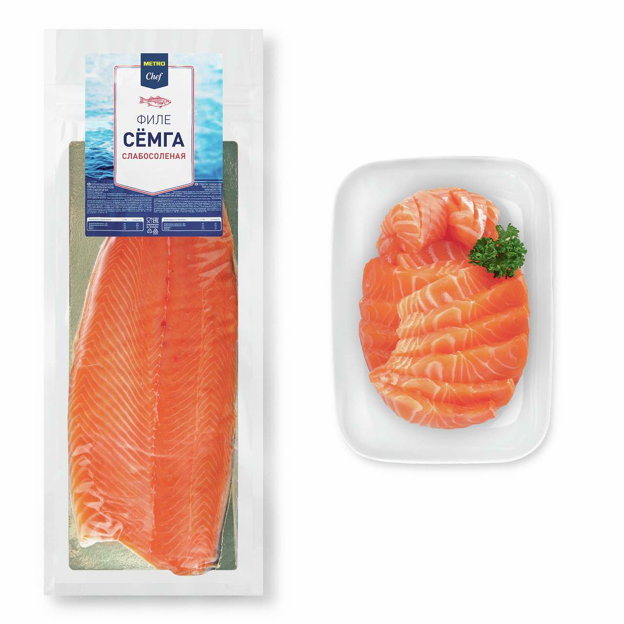 Семга филе METRO CHEF слабосоленая изготовлена из охлажденной рыбы по традиционной рецептуре. Нежное филе имеет умеренный соленый вкус и уже готов к употреблению. Семга богата жирными кислотами Омега-3, которые благоприятно влияют на сердечно-сосудистую систему, укрепляют ее и уничтожают излишки холестерина.