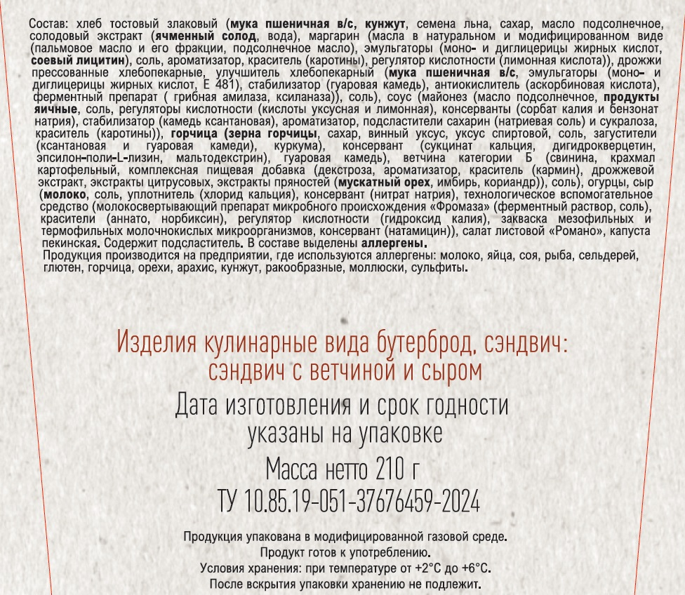 Хлеб тостовый злаковый (мука пшеничная, кунжут, семена льна, сахар, масло подсолнечное, солодовый экстракт ячменный солод, вода, маргарин масла в натуральном и модифицированном виде пальмовое масло и его фракции, подсолнечное масло, эмульгаторы моно - и диглицериды жирных кислот, соевый лецитин, соль, ароматизатор, краситель каротины, регулятор кислотности лимонная кислота, дрожжи прессованные хлебопекарные, улучшитель хлебопекарный мука пшеничная, эмульгаторы моно - и диглицериды жирных кислот, Е481, стабилизатор гуаровая камедь, антиокислитель аскорбиновая кислота, ферментный препарат грибная амилаза, ксиланаза), соль, соус майонез масло подсолнечное, продукты яичные, соль, регуляторы кислотности кислоты уксусная и лимонная, консерванты сорбат калия и бензонат натрия, стабилизатор камедь ксантановая, ароматизатор, подсластители сахарин натриевая соль и сукралоза, краситель каротины, горчица зерна горчицы, сахар, винный уксус, уксус спиртовой, соль, загустители ксантановая и гуаровая камеди, куркума, консервант сукцинат кальция, дигидрокверцетин, эпсилон-поли-L-лизин, мальтодекстрин, гуаровая камедь, ветчина категории Б (свинина, крахмал картофельный, комплексная пищевая добавка декстроза, ароматизатор, краситель кармин, дрожжевой экстракт, экстракты цитрусовых, экстракты пряностей мускатный орех, имбирь, кориандр, соль, огурцы, сыр молоко, соль, уплотнитель хлорид кальция, консервант нитрат натрия, технологическое вспомогательное средство) салат листовой Роман капуста пекинская.