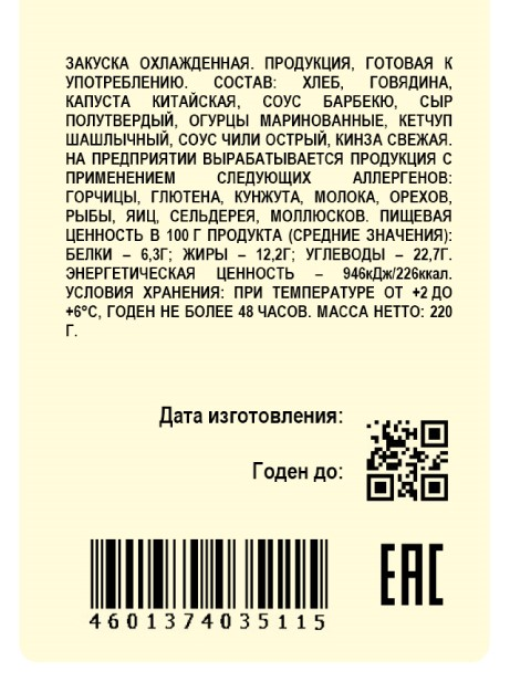 Хлеб, говядина, капуста китайская, соус Барбекю, сыр полутвердый, огурцы маринованные, кетчуп шашлычный, соус Чили острый, кинза свежая.
