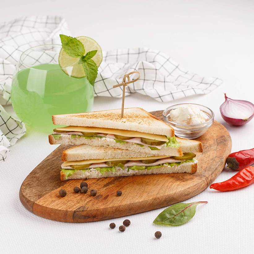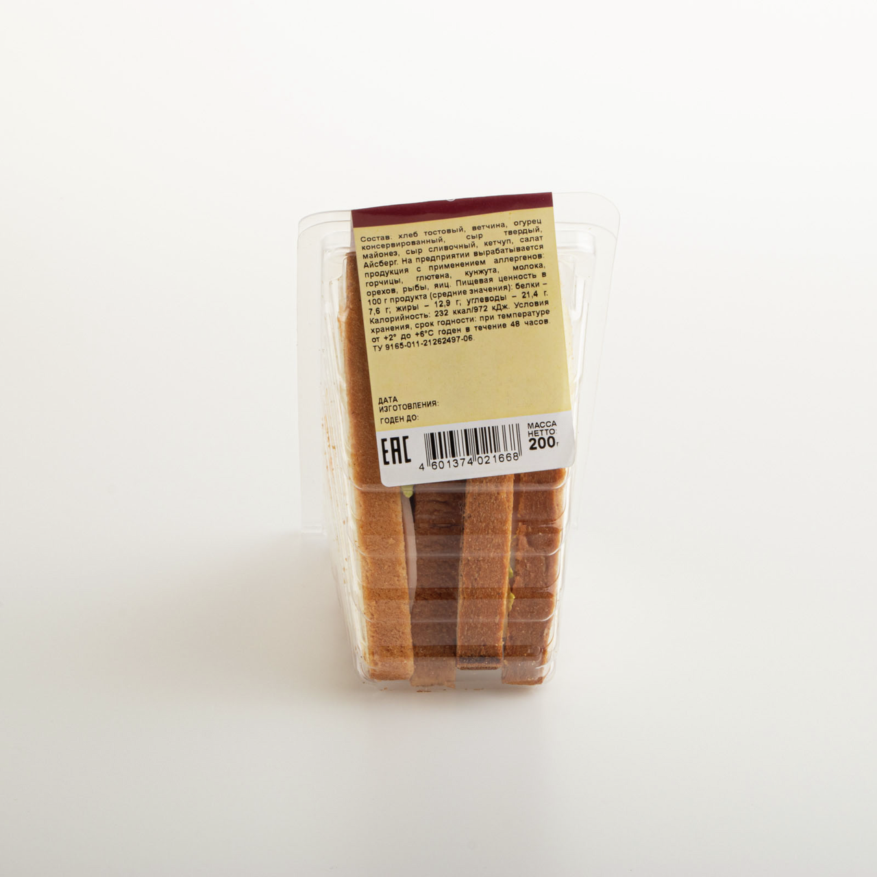 Хлеб тостовый, ветчина, огурец консервированный, сыр твердый, майонез, сыр сливочный, кетчуп, салат Айсберг.