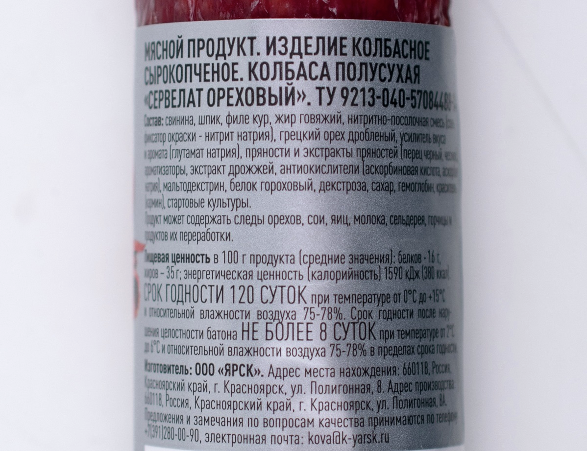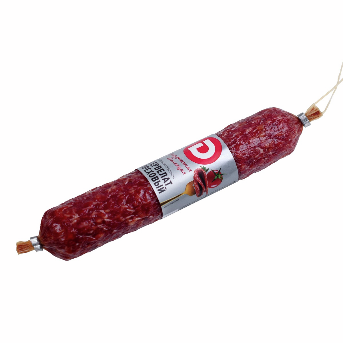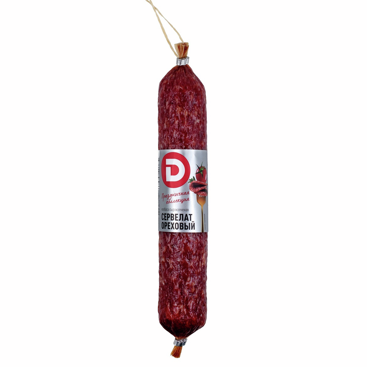 Производится из отборной свинины и говядины и добавляем кусочков грецкого ореха. Сервелат имеет красивый срез и украсит любую мясную тарелку. Эта колбаса коптится на натуральной буковой щепе, приобретая аппетитный аромат. Сервелат подойдет для салатов или для холодных закусок – небольших бутербродов с сыром и свежими овощами.