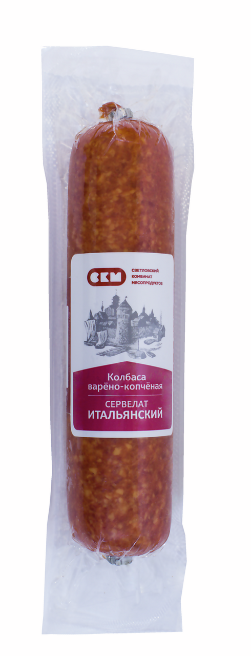 Сервелат Итальянский СКМ варено-копченый, 350г – продукция, в основе которой лежит натуральное мясо. Обладает классическим ярким вкусом сервелата и приятным ароматом, пробуждающим аппетит. Окраска на разрезе однородная, а консистенция плотная и упругая, без каких-либо рыхлостей. Продукт хорошо утоляет чувство голода и насыщает организм, что делает его превосходным выбором для любого приема пищи или быстро перекуса, например, во время обеденного перерыва. Варено-копченый сервелат – прекрасный ингредиент, который может широко применяться для приготовления разнообразных блюд. В частности, его используют в рецептах первых и вторых блюд, салатов, а также закусок и бутербродов. Пикантный вкус продукта помогает разнообразить состав других ингредиентов, например, овощей в рагу.