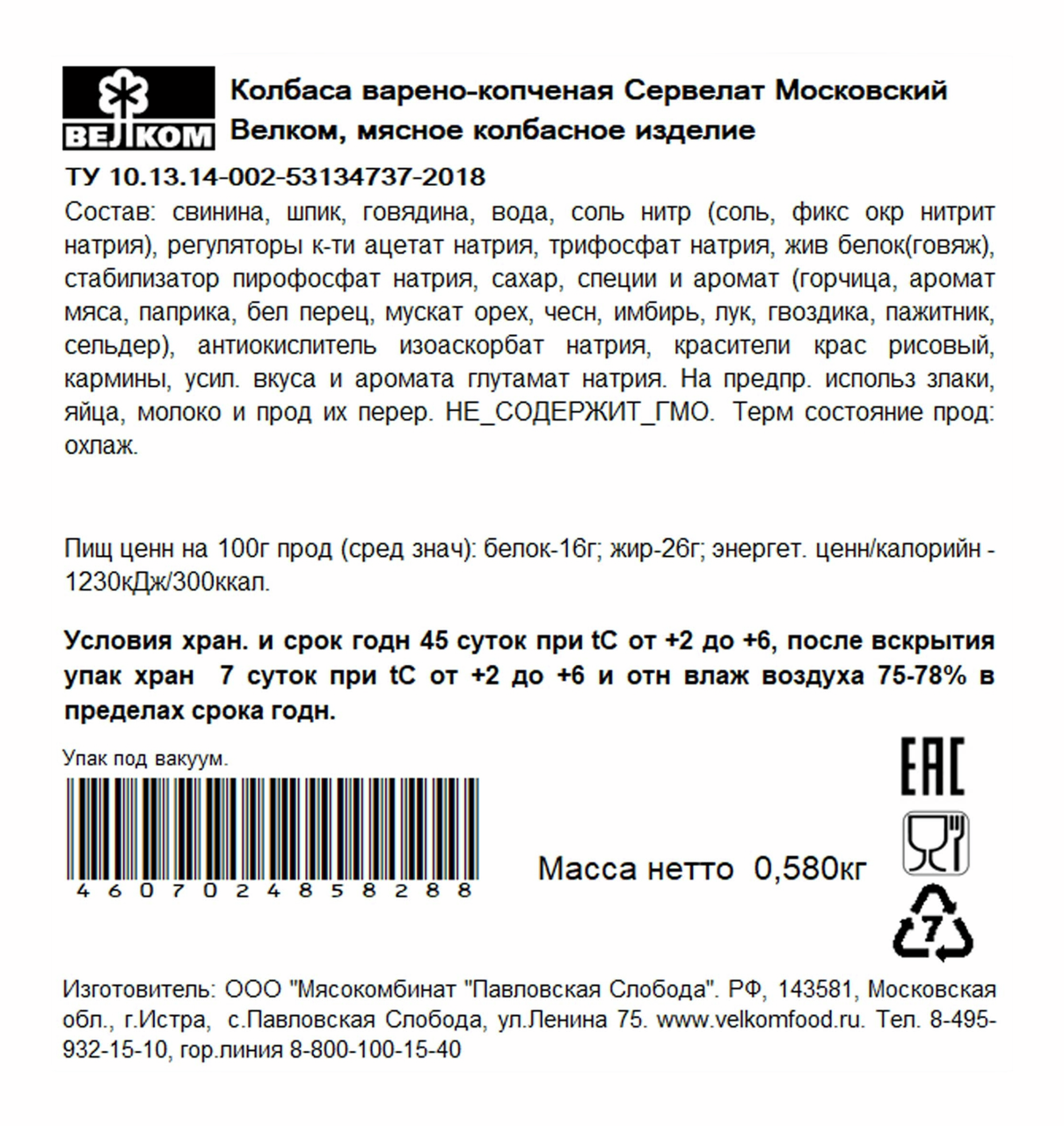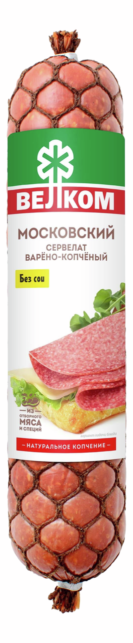 Колбаса Велком Сервелат Московский варено-копченая, 580г