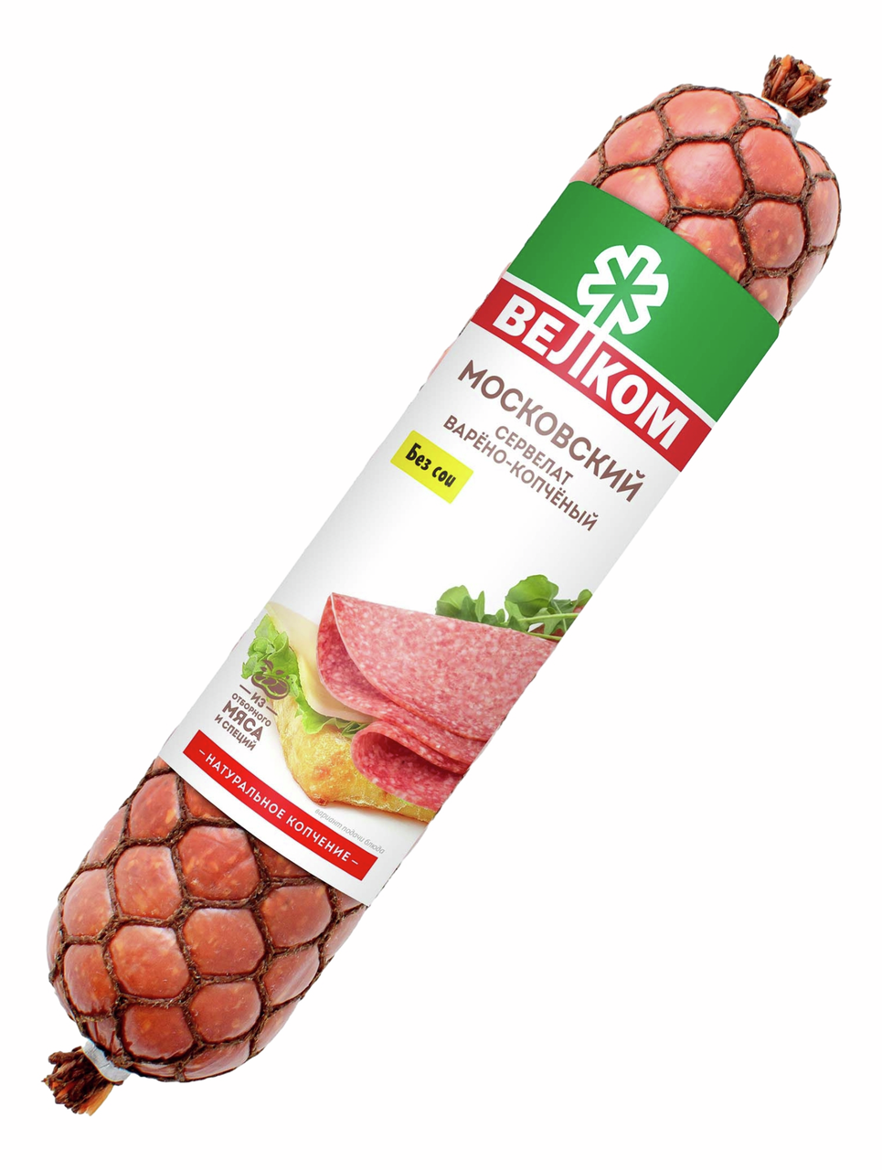 Колбаса Велком Сервелат Московский варено-копченая, 580г – ароматный мясной деликатес, приготовленный по особому рецепту с добавлением ароматных пряностей.
