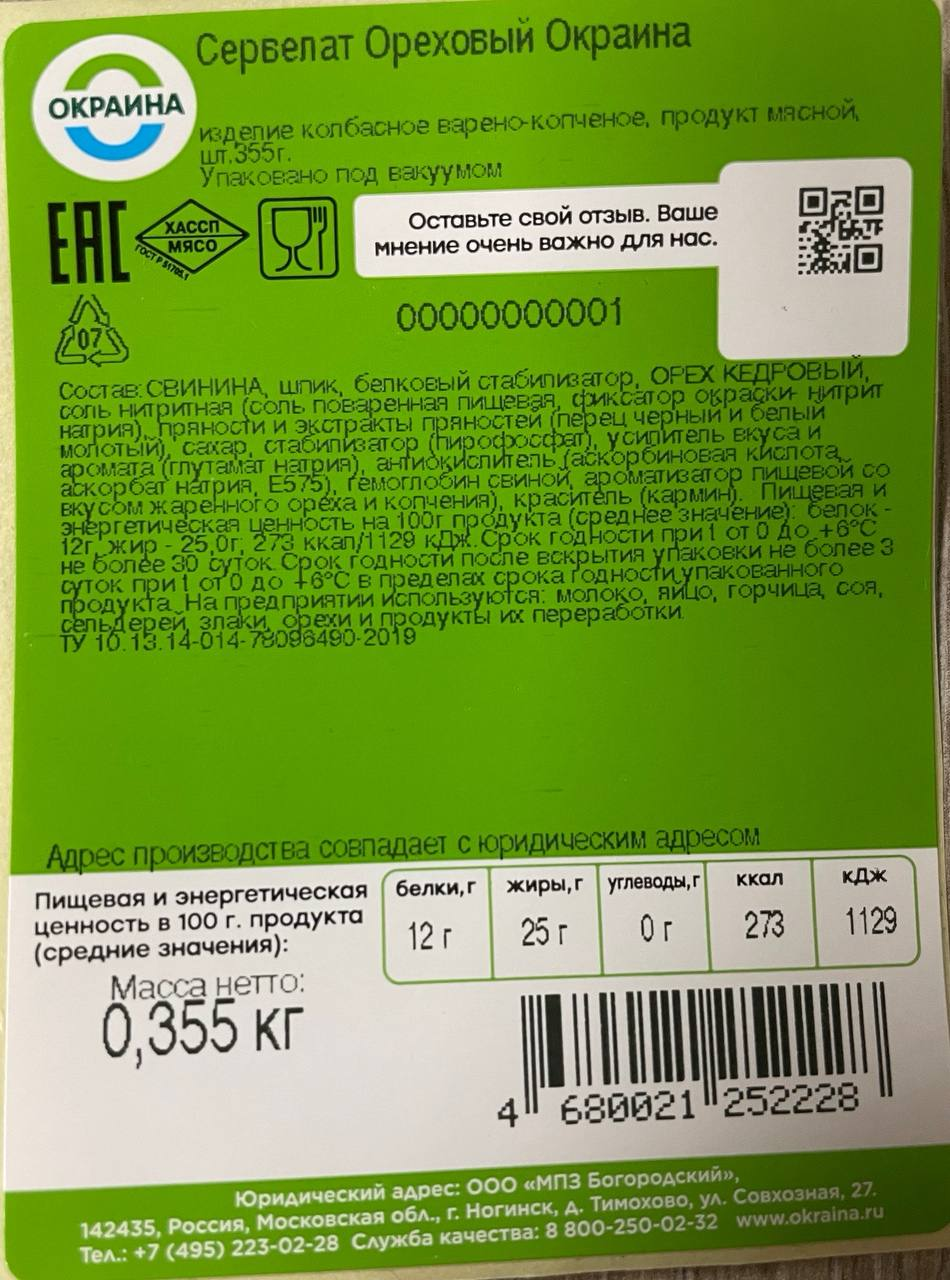 Сервелат Ореховый - это сбалансированное сочетание свинины и натуральных кедровых орехов, подчеркнутое ароматами кориандра, мускатного ореха и тмина. Ядра орешков не только дополняют продукт по консистенции, но и вносят сладковато-ореховую нотку. Продукт создан для ценителей незабываемых гастрономических впечатлений, когда один аромат сменяет другой, создавая неповторимый букет и приятное послевкусие, а также жгучее желание попробовать еще хотя бы кусочек.