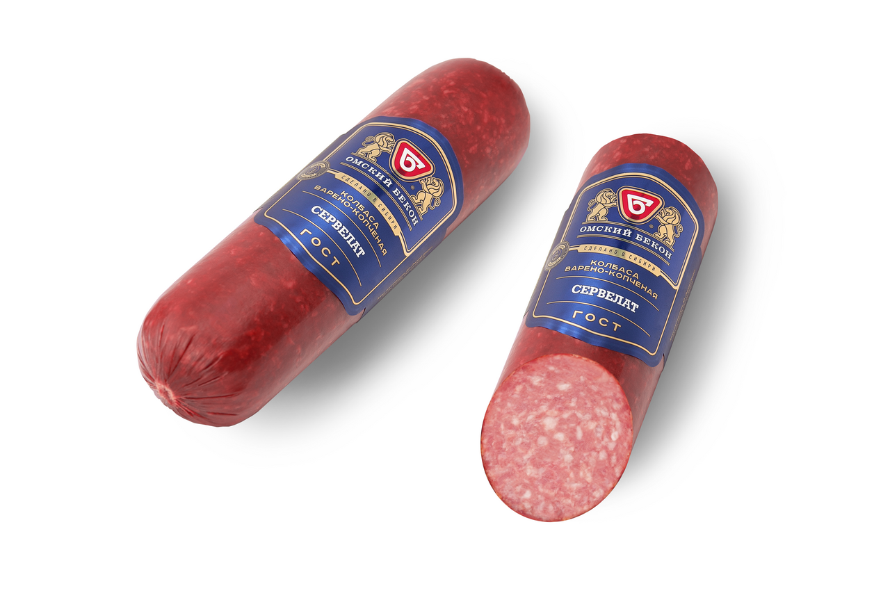 Колбаса Омский бекон Сервелат варено-копченая ГОСТ, 380 г — оригинальная вариация на тему классического рецепта, который был придуман еще в XVI веке. Производитель из Омска использовал для улучшения вкуса черный перец, кардамон и мускатный орех. В качестве основных ингредиентов фигурируют охлажденные свинина и говядина, а также свиная грудинка. На срезе хорошо видно розовое мясо с мелкими белыми вкраплениями шпика. Продукт имеет среднезернистую текстуру и насыщенный яркий вкус. Он представлен в виде классического круглого батона в искусственной оболочке.