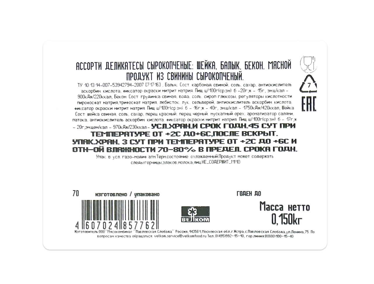 Ассорти деликатесов Велком сырокопченая нарезка, 150г – вкусный деликатес из качественных ингредиентов. Традиционный и любимый многими сервелат с понятным составом с минимальным количеством компонентов. Колбаса приятного розового цвета. Продается в упаковке, которая максимально сохраняет вкусовые качества и свежесть. Полукопченый продукт идеально подходит для бутербродов, оригинальных салатов или простой мясной нарезки к столу. Сервелат разработан на основании классических рецептов сервелата: отборная нежная говядина и мелкие кусочки шпика придают продукту отличный вкус, сочную консистенцию и красивый срез. Сочетание специй создает уникальный насыщенный вкус и аромат.