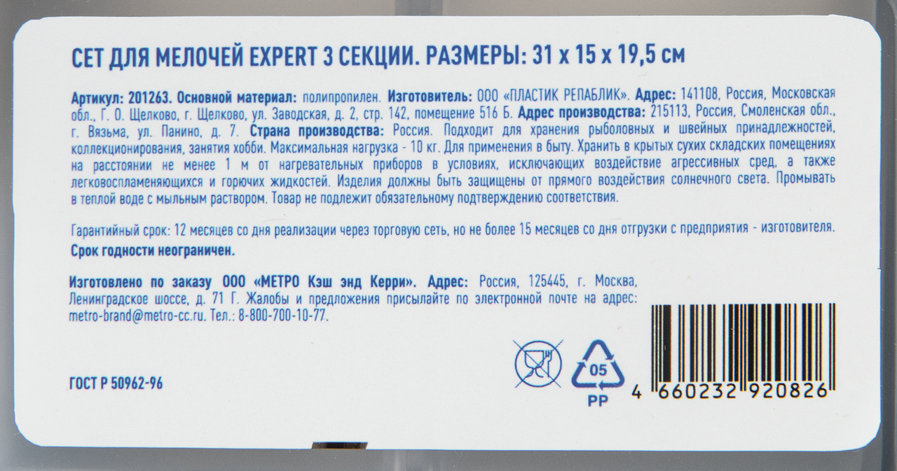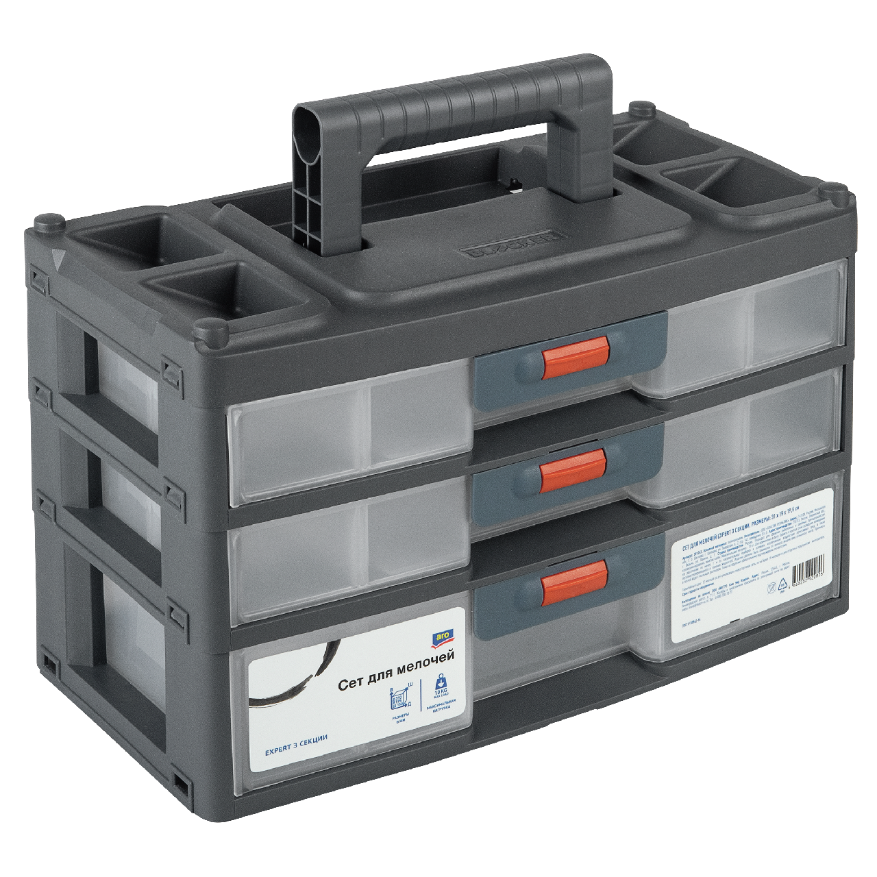 Идеален для использования дома, на даче, в гараже, мастерской, в автомобиле. Секции снабжены замками, предотвращающими случайное открытие. Внутреннее деление секций на отсеки делает удобным размещение внутри органайзера деталей, которые необходимо отделить друг от друга. Съемные перегородки позволяют изменять размер отсеков под личные нужды. Прозрачная передняя часть секций позволяет увидеть их содержимое в закрытом состоянии. В крышке имеются выемки для временного хранения мелких деталей. Подходит для хранения рыболовных и швейных принадлежностей, коллекционирования, занятия хобби.