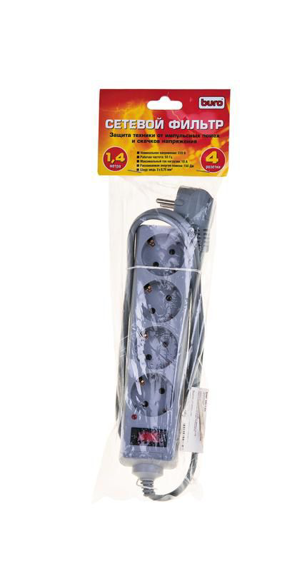 Buro Сетевой фильтр. Количество розеток: 4. Длина шнура: 1,4 м. Номинальное напряжение: 220 В. Защита от импульсных помех. 4 розетки-евростандарт с заземляющим контактом для штепселей диаметром. Выключатель с индикатором. Автоматический предохранитель от перегрузок. Шнур питания с вилкой евростандарт.