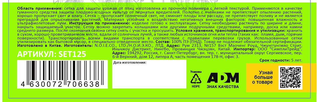 Сетка для защиты урожая Nadzor 2 x 5м - сетка для защиты урожая от птиц изготовлена из прочного полимера с легкой текстурой. Применяются в качестве гуманного средства защиты плодово-ягодных культур от пернатых вредителей. Полотно с ячейками не препятствует опылению растений, хорошо пропускает свет и влагу. Сетка пропускает солнечный свет, не сминает плоды или рассаду, не препятствует поливу и не является преградой для опрыскивания растений. Материал устойчив к воздействию негативных внешних факторов: повышенная влажность и ультрафиолетовые лучи.