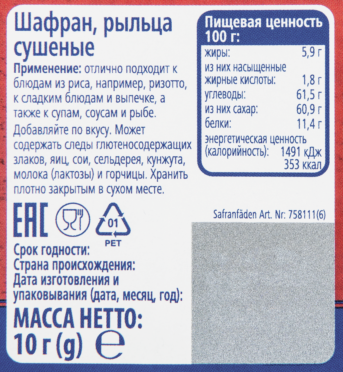 Шафран METRO Chef рыльца, 10 г имеет пряный горьковатый вкус с ноткой меда и окрашивает пищу в желтый цвет. В состав специи входят различные витамины, макро- и микроэлементы. Шафран заключает в себе множество полезных свойств. Он способна укреплять, омолаживать организм, снимать боли, спазмы, улучшать работу почек и мочеполовой системы. В кулинарии шафран используется в нескольких целях: как натуральный краситель для продуктов, для тушения и варки рыбы, как добавка к кофе, чаю, в приготовлении выпечки, для продления срока годности блюд. Приправа хорошо сочетается с мясом, маслом и соусами.