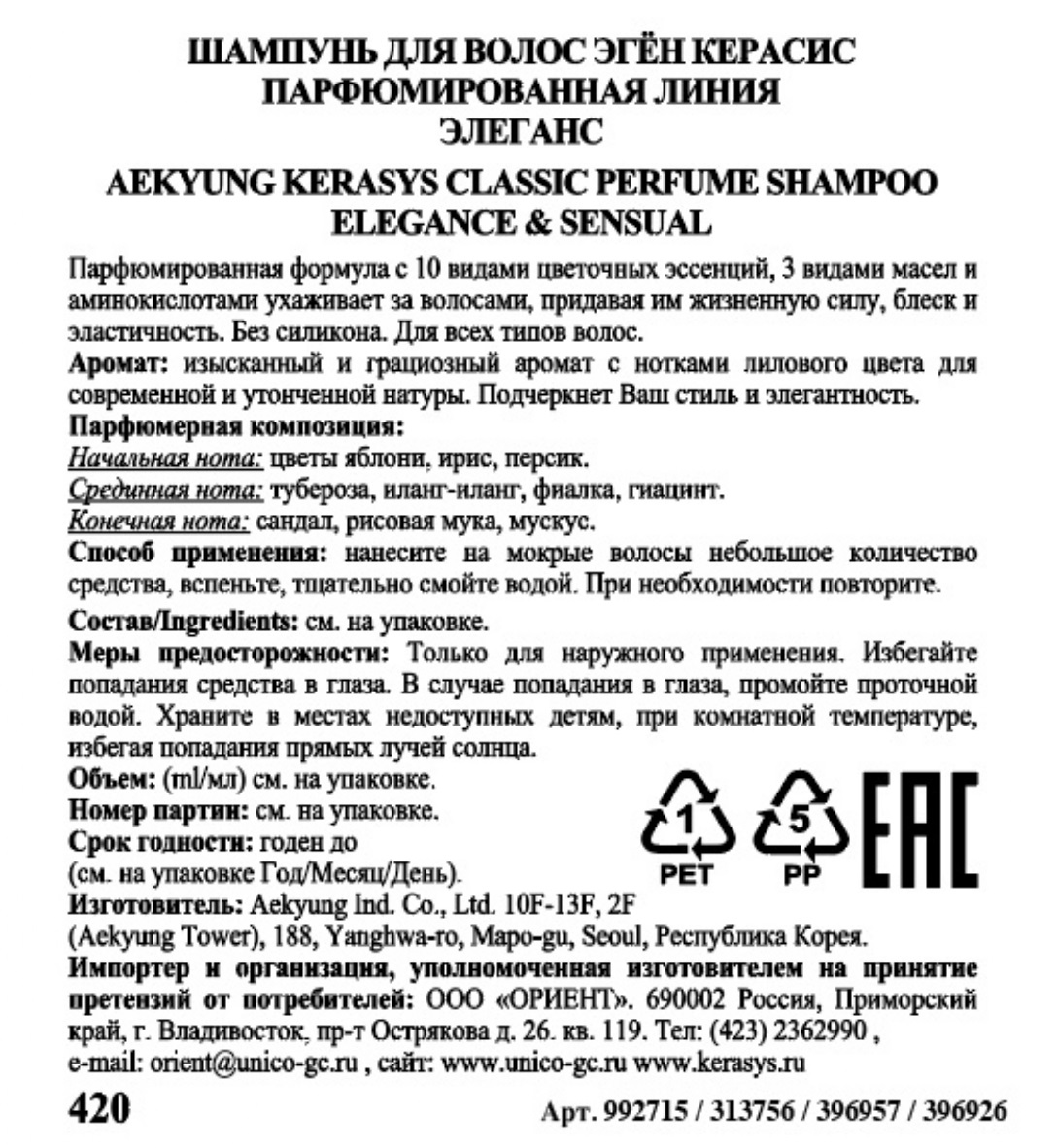 Уникальный и утонченный парфюмированный уход для тонких и ослабленных волос. Исследовательский институт парфюмированных ингредиентов Aekyung industrial провел сравнительный анализ самых популярных и горячо любимых ароматов элитной парфюмерии. Результатом этого исследования стало создание уникального и утонченного парфюмированного ухода для тонких и ослабленных волос - Kerasys Perfumed Line. Kerasys Perfumed Line - это специально разработанная формула, которая укрепляет и восстанавливает структуру волос по всей их длине. Благодаря этому, ваши волосы обретают жизненную силу, эластичность и объем. Продукт содержит витамины А и Е, масло оливы и масло ши, которые питают и увлажняют волосы, делая их здоровыми и блестящими. Особенностью Kerasys Perfumed Line является отсутствие силиконов в составе. Это позволяет коже головы оставаться свежей и чистой. Также, шампунь имеет низкокислотный уровень pH, что обеспечивает мягкое очищение волос и кожи головы. Однако, главной особенностью продуктов Kerasys Perfumed Line является его стойкий аромат. Шампунь предназначен для ухода за тонкими и поврежденными волосами. Он рекомендован к использованию после агрессивных салонных процедур, связанных с термическим и химическим воздействием. Масло оливы дает волосам силу, сияние и защиту от внешних факторов. Локоны становятся крепче и эластичнее. Масло ши питает и увлажняет, придает здоровый вид. Волосяные стволы становятся более толстыми, исчезает ломкость и сечение кончиков. Витаминный коктейль способствует сиянию локонов и увеличению объема. Парфюмерная композиция включает в себя ароматы розы, иланг-иланг и гиацинта.