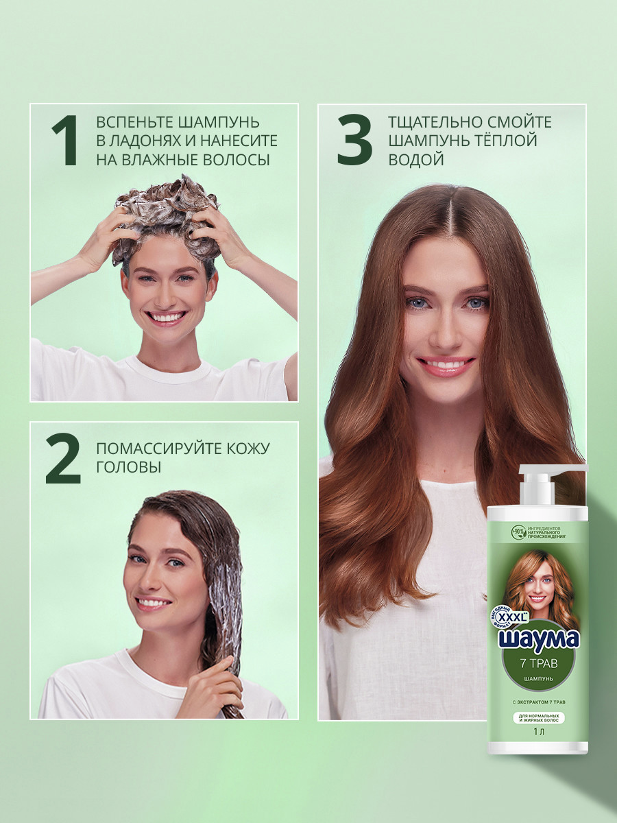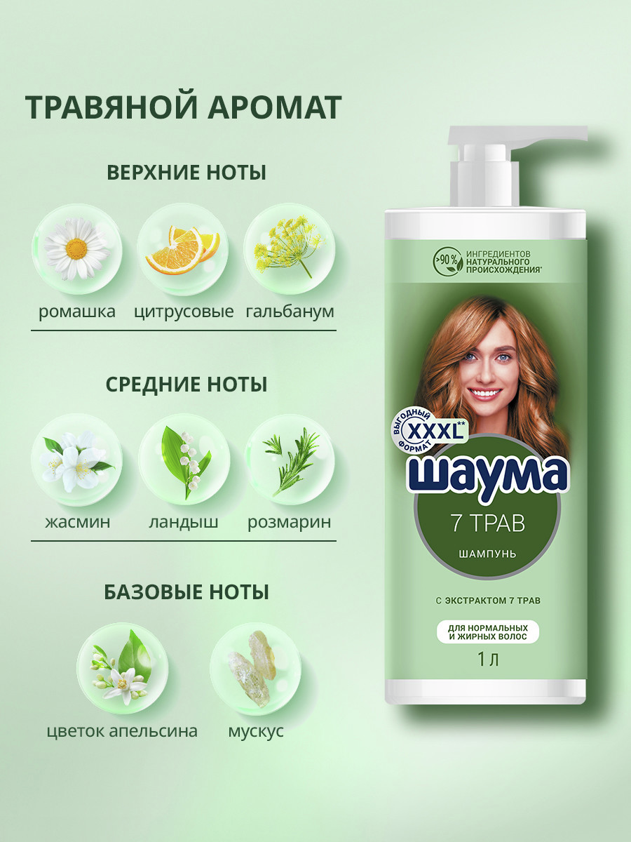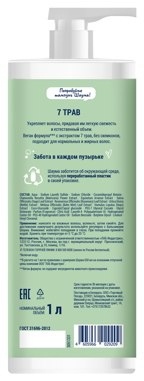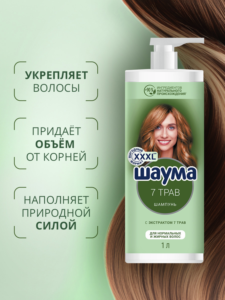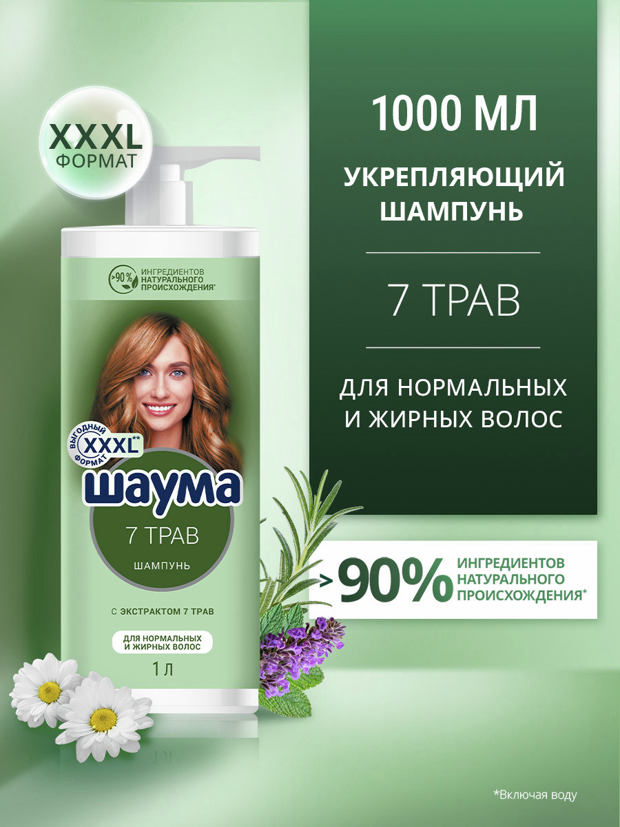 Шаума 1000мл Шампунь 7 Трав для нормальных и жирных волос: - Укрепляет волосы; - Придает волосам свежесть и естественный объем; - с экстрактом 7 трав: розмарин, ромашка, хмель, хвоя, шалфей, крапива, мелисса- >90% ингредиентов натурального происхождения; - Веган формула без силиконов; - подходит для нормальных и жирных волос. Бережно очищает нормальные и жирные волосы, регулирует работу сальных желез. Придает свежесть и легкость, продлевает чистоту прически. Натуральные компоненты ухаживают за волосами и кожей головы, смягчают и увлажняют. Идеален для ежедневного применения.