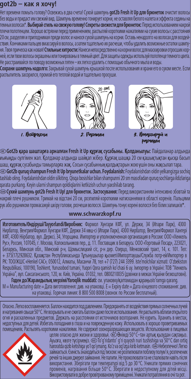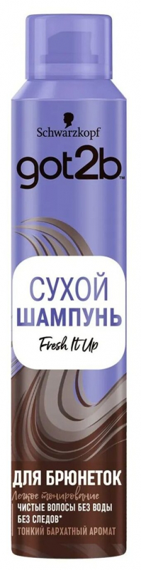Got2b – как я хочу! Нет времени помыть голову? Освежись в два счета! Сухой шампунь got2b Fresh it Up для брюнеток очистит волосы без воды и придаст им свежий вид. Шампунь временно тонирует корни, не оставляя белого налета и эффекта седины на темных волосах. Выбирай стиль на свежую голову!