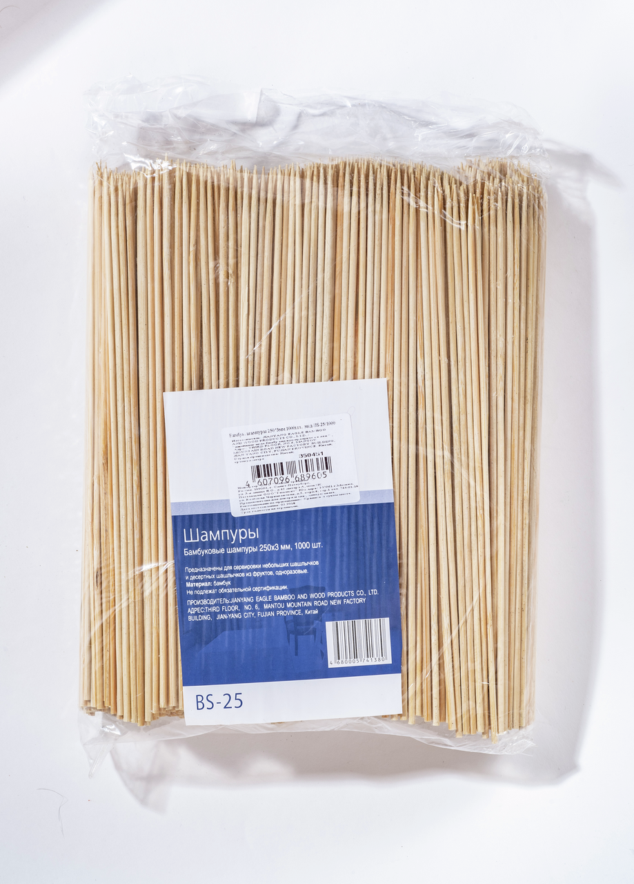 Cостав короба: 1шт. Шампуры бамбуковые. Размер: 25 см х 3 мм. В упаковке 1000 штук. Условия хранения: в сухом месте Срок хранения: Не ограничен