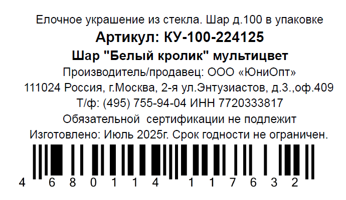 Шар елочный Коломеев Белый кролик мультицвет, 10см