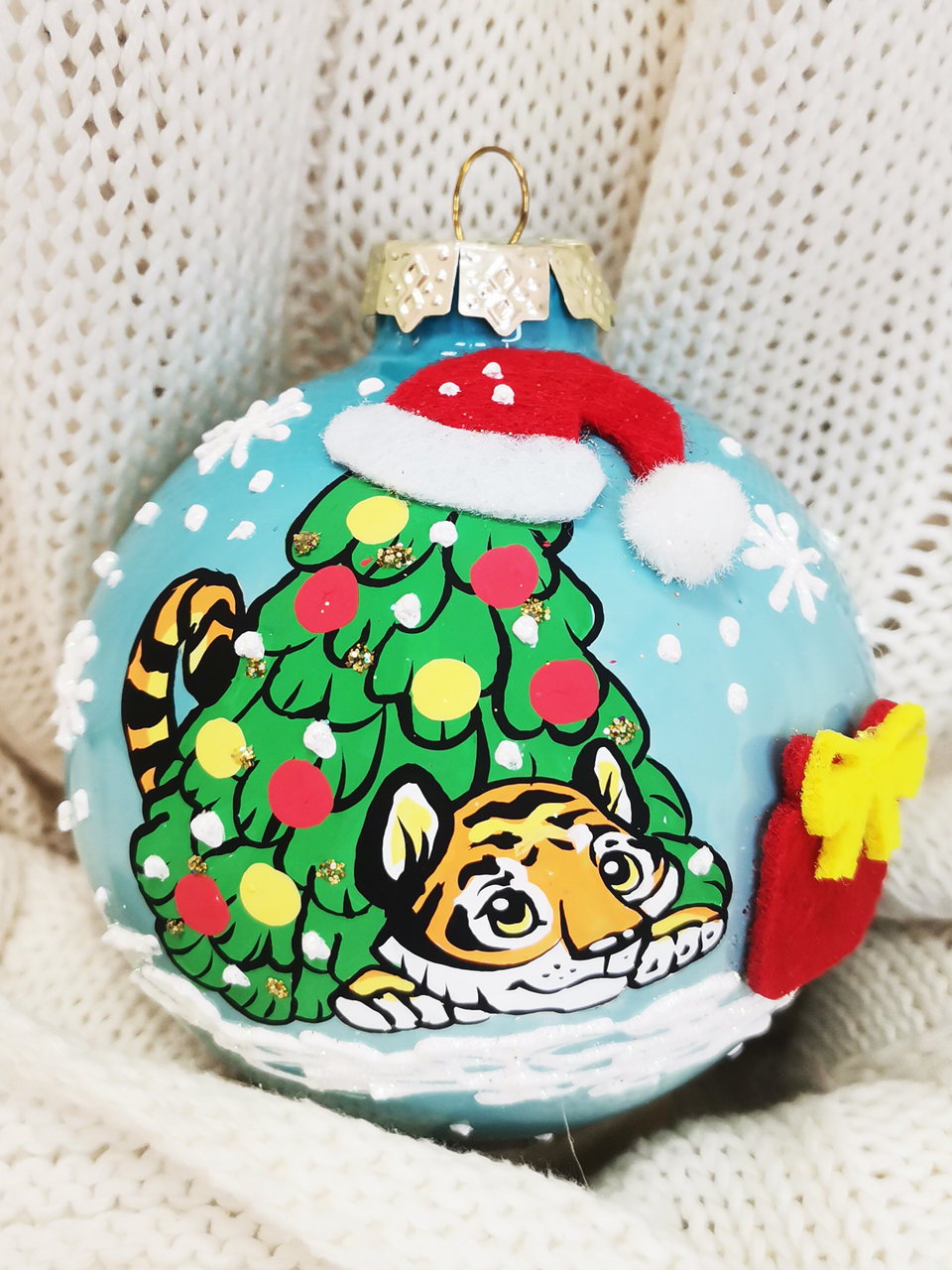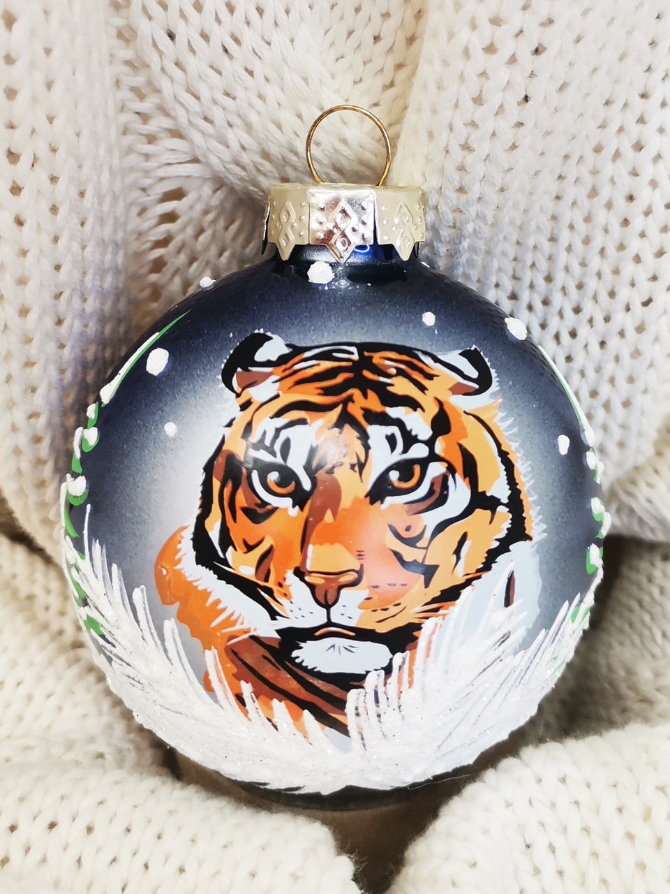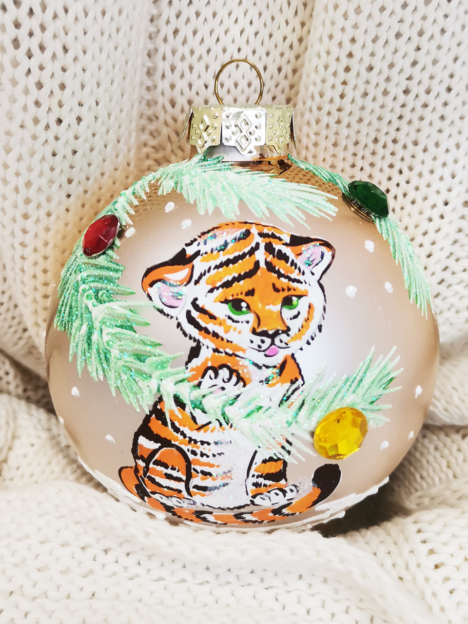 Шар тигр в подарочной упаковке в ассортименте, 85мм будет красиво смотреться в обрамлении зеленой и белой хвои, создаст причудливые переливы рядом со сверкающими лампочками гирлянд. Он отлично подойдет для декорирования большой и средней елочки. Аксессуар выполнен из стекла и расписан вручную. Рисунок вызывает ощущение зимней сказки и новогоднего волшебства. Для крепления аксессуара предусмотрен классический ободок из проволоки и металлический колпачок. Упаковка позволяет надежно хранить и транспортировать изделие, делает его одним из удачных вариантов для новогоднего презента.