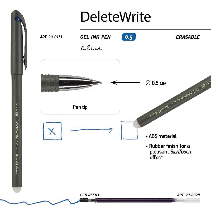 Ручка шариковая BRUNO VISCONTI синяя со стирающимися чернилами 0,5 мм, 1 шт. – незаменимый для школьника и студента предмет. Принцип прост: под воздействием тепла и при трении чернила полностью стираются, не оставляя следов. При этом лист остается цел и не вредим. Ручка поставляется в ассортименте – в разных цветах, поэтому каждый сможет найти свой идеальный вариант.