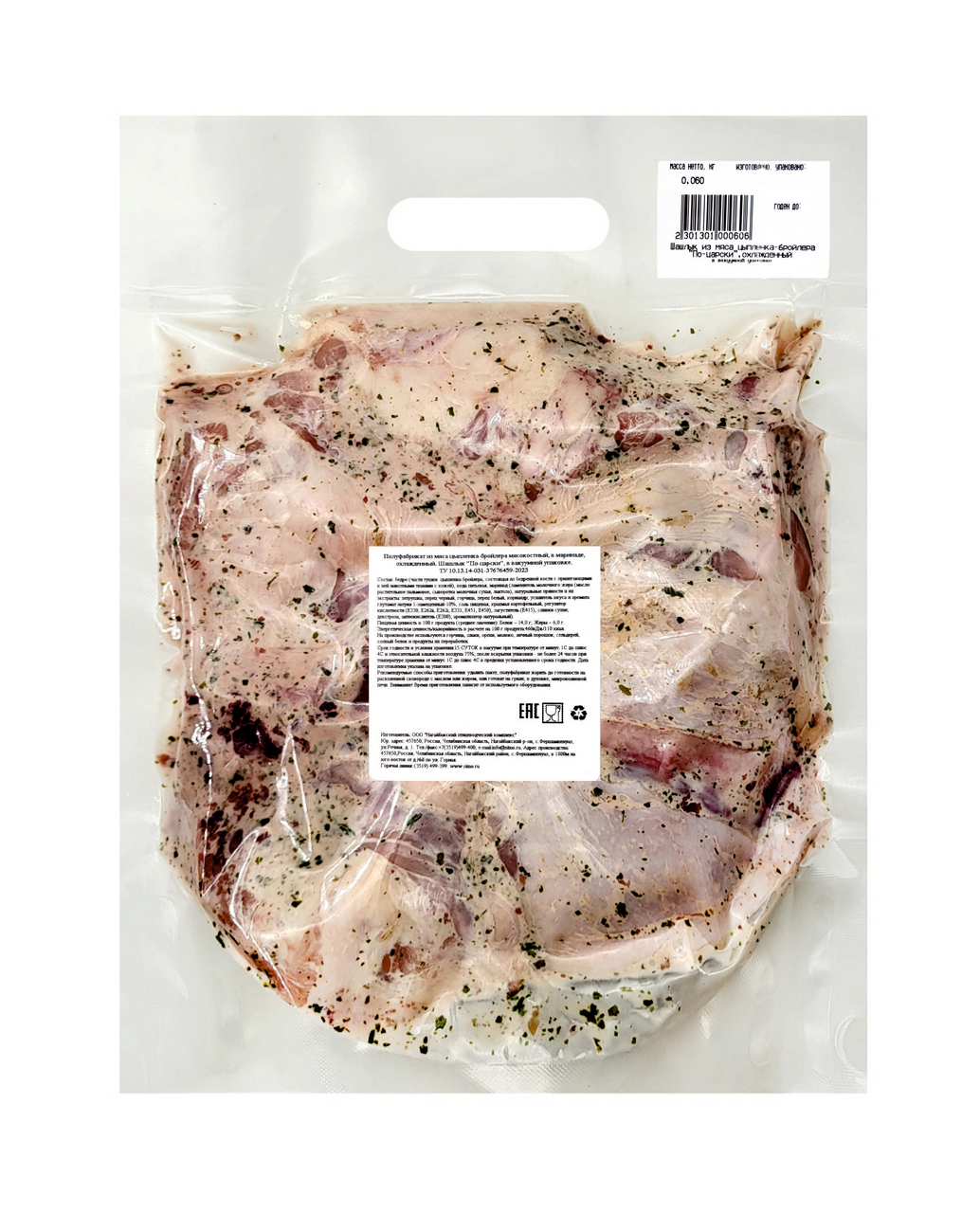 Мясо цыплят-бройлеров на кости, маринад (соль поваренная, пряности, регулятор кислотности Е450, стабилизатор Е415, усилитель вкуса и аромата Е621, сахар).