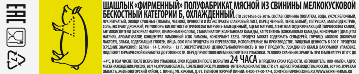 Выдержан в традиционном маринаде с добавлением репчатого лука и ароматного черного перца. Шашлык можно обжарить на гриле, мангале и шампурах. Мясо после приготовления получается очень сочным и приобретает характерный аромат дымка.