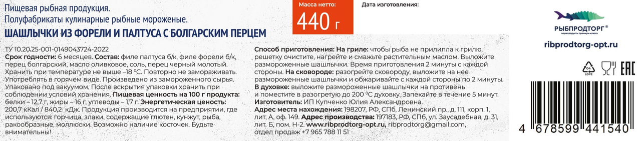 Шашлык Рыбпродторг форель и палтус с болгарским перцем замороженный, 440г