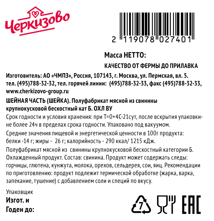 Шейка свиная Черкизово без кости охлажденная, ~3кг – это нежное свиное мясо на шее животного с небольшими прожилками сала. Отличается высоким содержанием белка, богата цинком, железом, аминокислотами. Это прекрасное сочетание жилок с жирком и нежнейшего мяса без накачанных мускулов. Свиные шейки отлично сочетаются с различной ягодой и фруктами, например, с курагой или черносливом. К этому мясу также хорошо подойдут кисло-сладкие яблоки. Замечательный вкус дает сочетание свинины с любыми грибами. Именно из свиной шейки зачастую получается самый вкусный свиной шашлык.