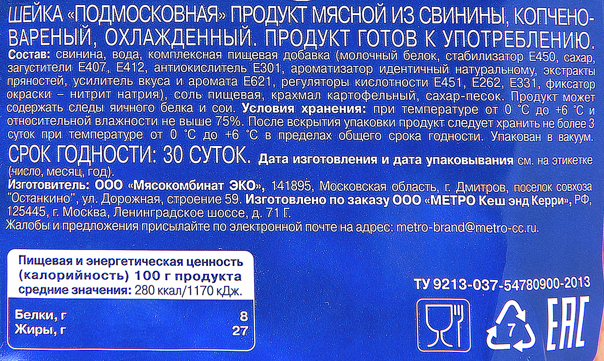 METRO Chef Шейка Подмосковная варено-копченая, ~1.4кг