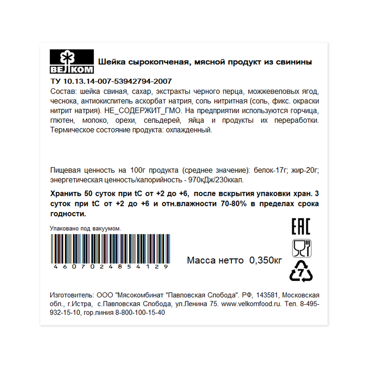Шейка сырокопченая Велком обладает тонким пикантным вкусом и ароматом сырокопченого мяса. Каждый этап производства контролируется по самым высоким стандартам – это гарантирует непревзойденное качество продукта. Шейку подают на стол в виде нарезки, предлагают с гарнирами, овощами и зеленью. Употребление такого блюда не только доставляет удовольствие дегустационными качествами, но и полезно для здоровья. Шейка быстро утоляет голод, восстанавливает силы, заряжает энергией, укрепляет мышцы, нормализует пищеварение.