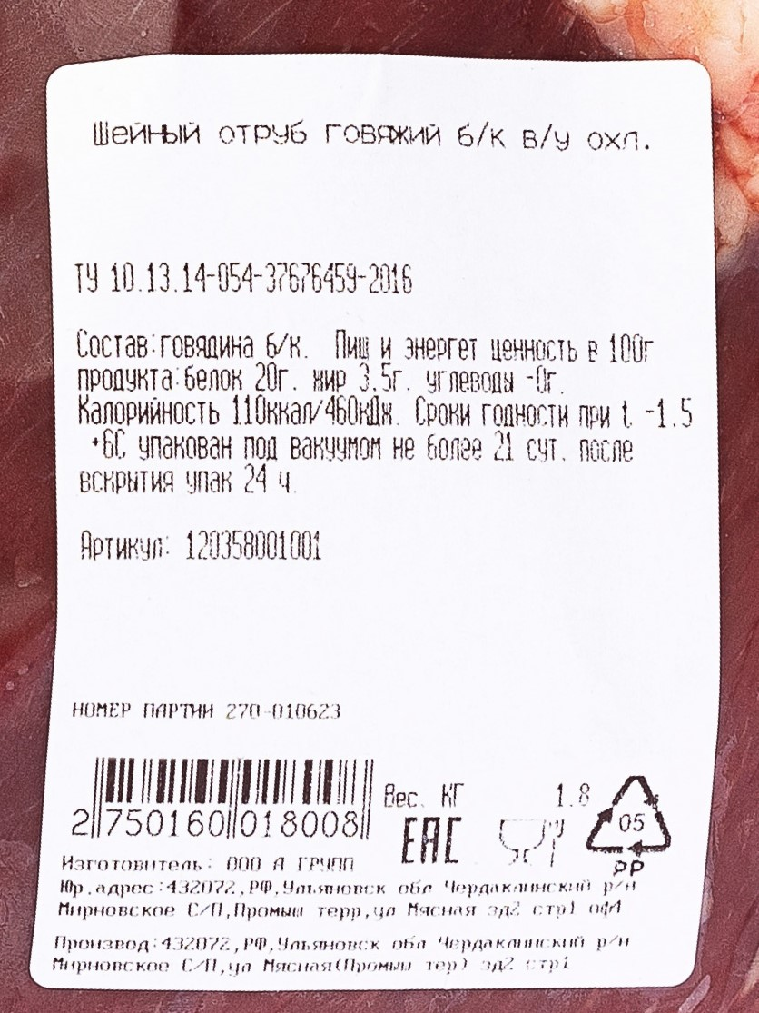 Шейный отруб говяжий Домашний Ресторатор без кости охлажденный, ~1.8кг