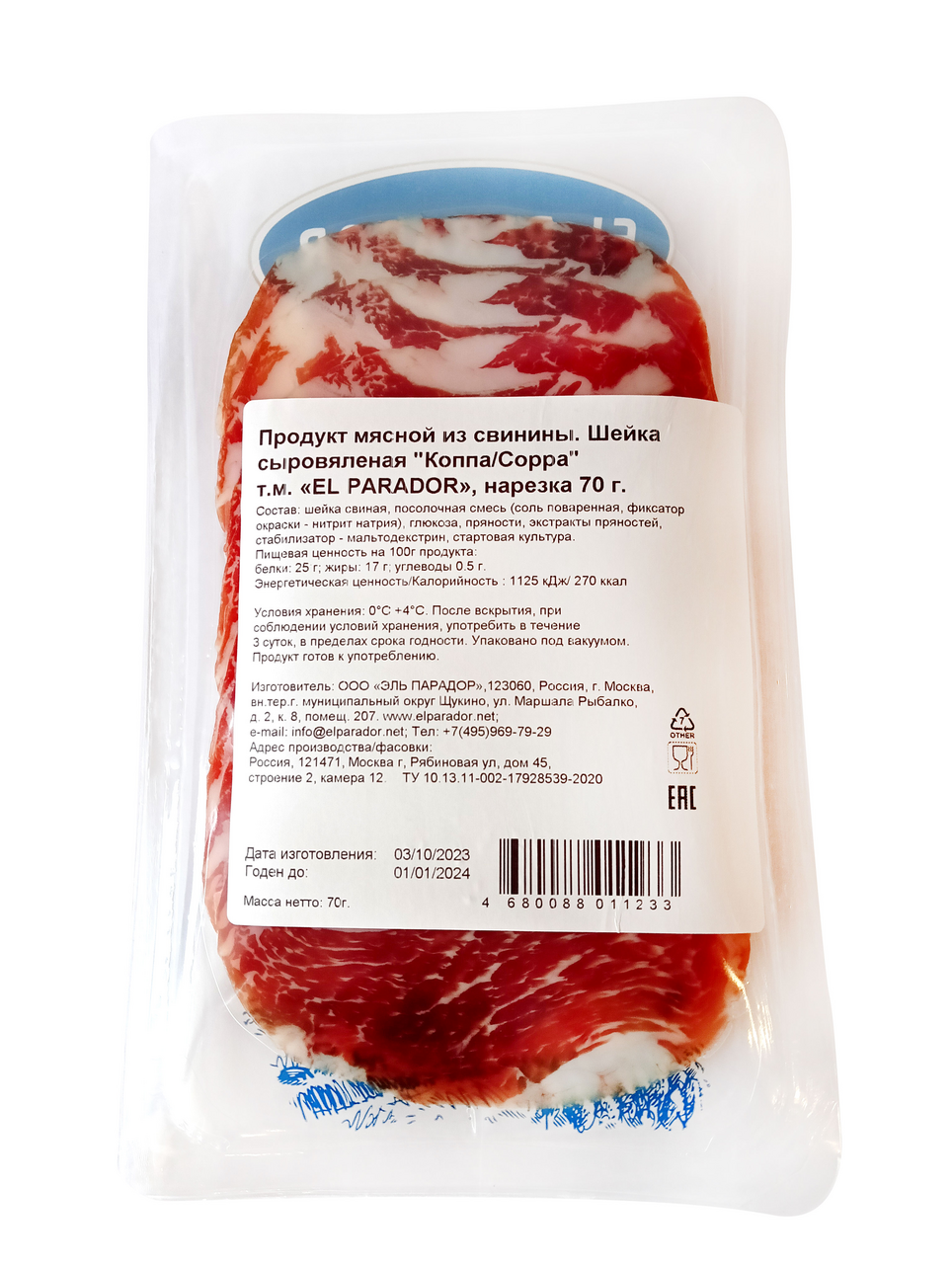 Шейка свиная El Parador Коппа сыровяленая, 70г