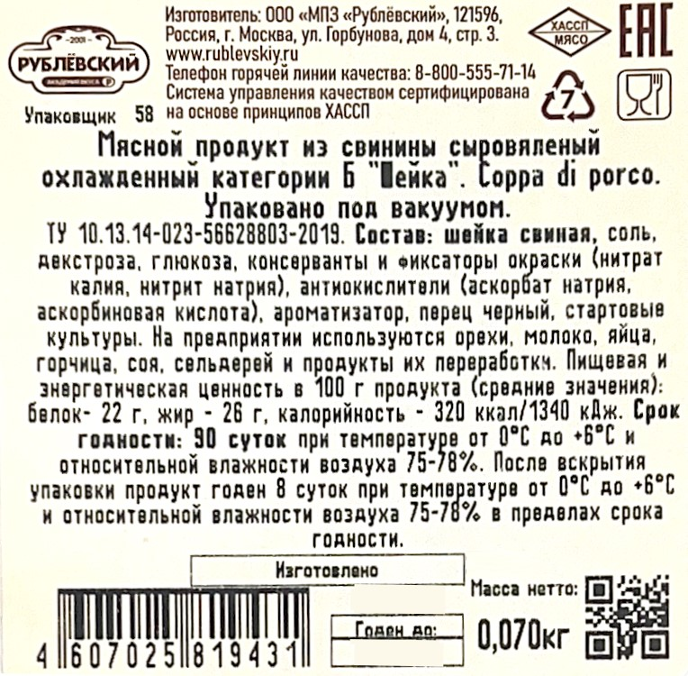 Шейка Рублевский Coppa di Porco свиная сыровяленая нарезка, 70г
