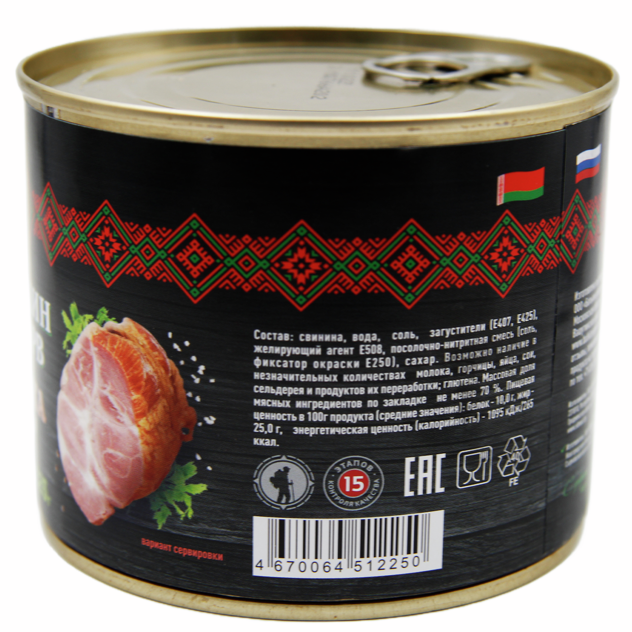 Свинина, вода, соль, загустители (E407, E425], желирующий агент E508, посолочно-нитритная смесь (соль, фиксатор окраски E250), сахар. Возможно наличие в незначительных количествах молока, горчицы, яйца, сои, сельдерея и продуктов их переработки, глютена.