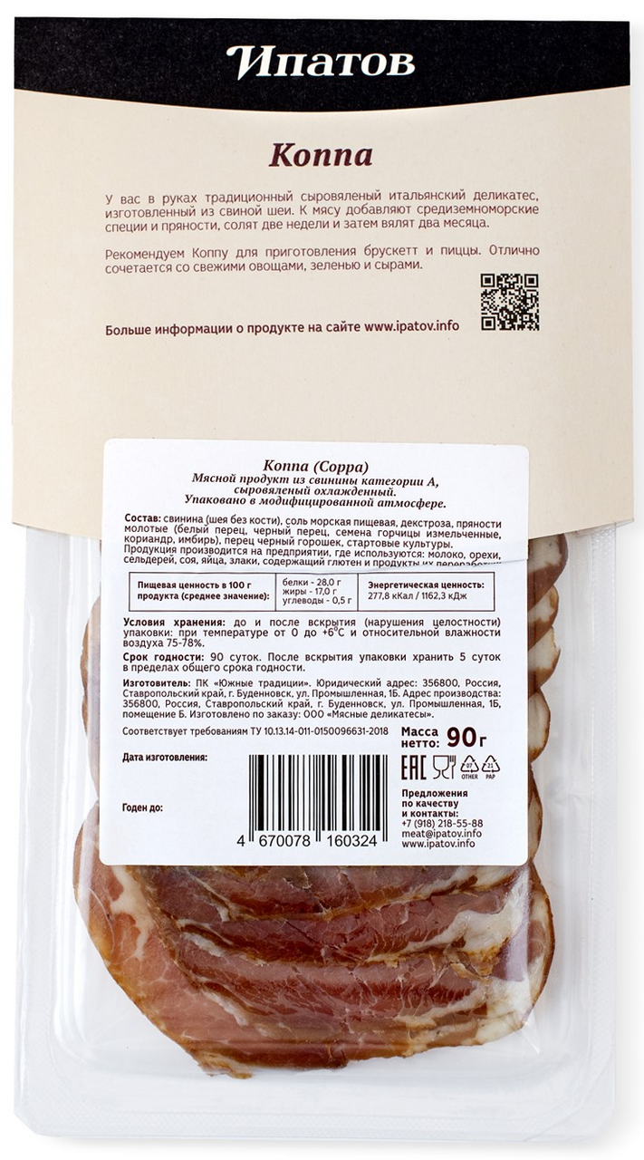 Шейка свиная Ипатов Коппа сыровяленая нарезка, 90г