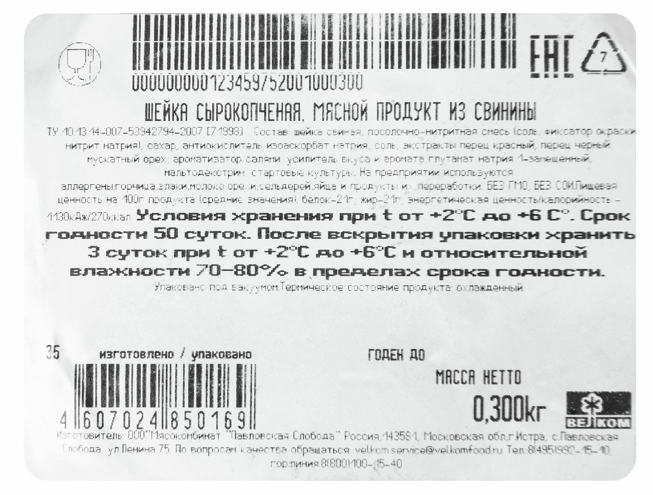 Шейка свиная, вода, соль, черный перец, антиокислители лимонная и аскорбиновая кислота, загуститель каррагинан из водорослей, краситель пищевой кармин, фиксатор окраски нитрит натрия.