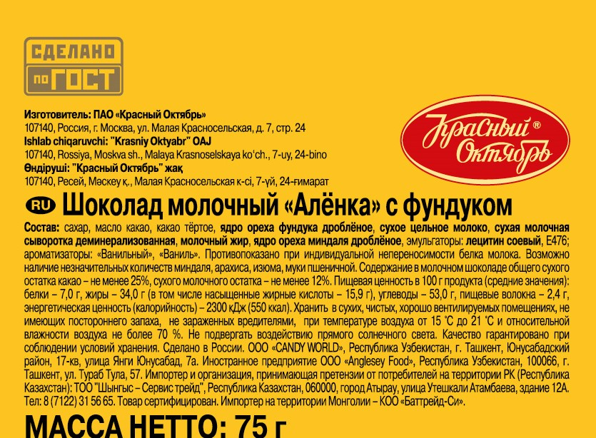 Классическое сочетание нежного молочного шоколада и ароматных осколков лесного ореха. Благодаря щедрой порции фундука привычный вкус шоколада Алёнка становится более пряным и изысканным. Сладкая нега легендарного шоколада расплескивает молочный вкус и тает, оставляя вас наедине с ореховой россыпью и ее мягким хрустом.
