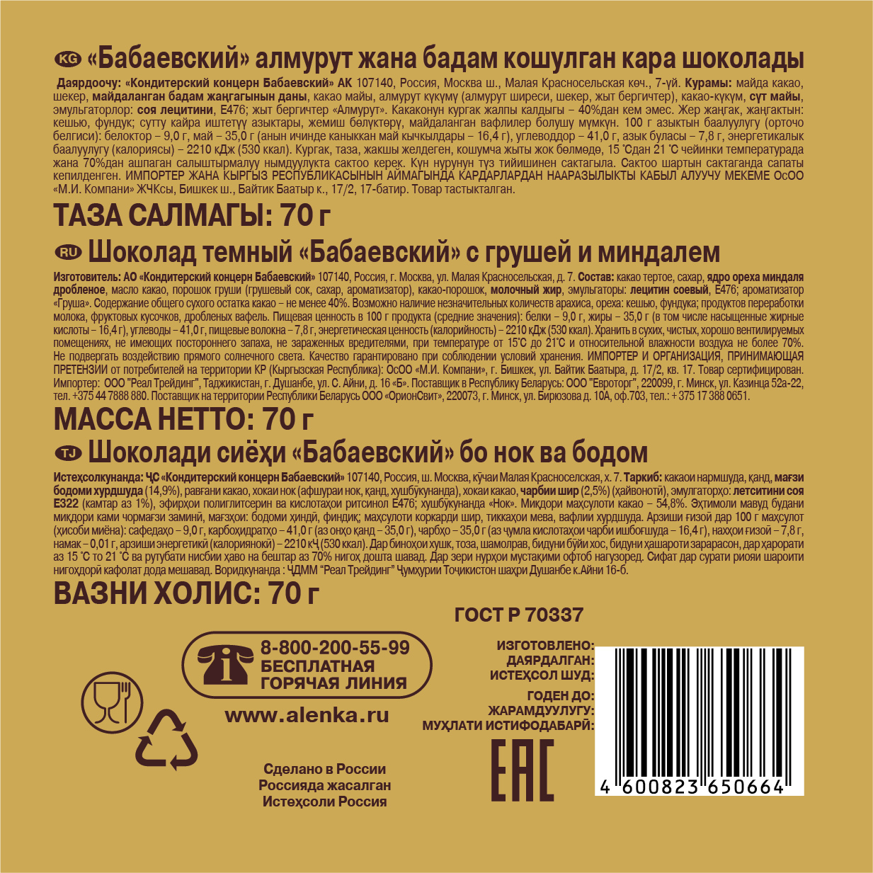 Шоколад Бабаевский темный груша и миндаль, 70г